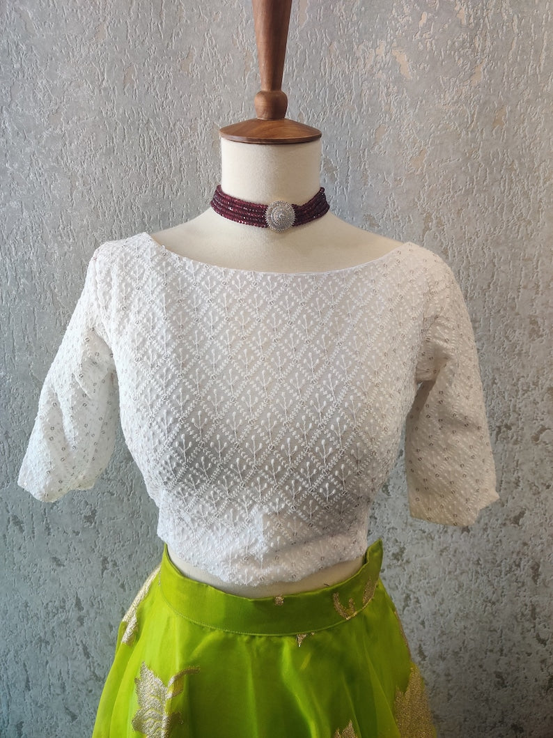 Crop Top | Designer Lehenga | Mehendi & Haldi Lehenga Choli | white green Lehenga Set | Indian Wedding Guest Outfit | Pre Wedding Ceremony Dress