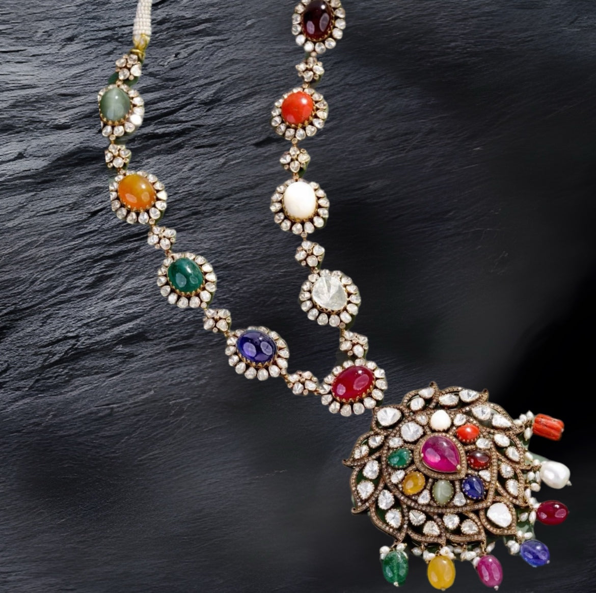 Navaratan Necklace - Cocktail Necklace - Tassel Necklace - 925 silver Jewelry,South Indian Jewelry,bridal choker,Indian Wedding Jewelry,pure Silver indian jewelry - SHABURIS